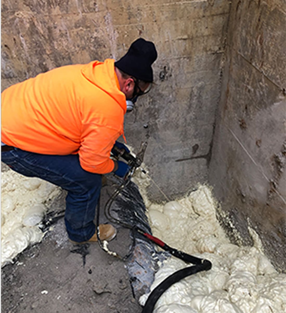 United Dynamics approached the project by spray applying the 24-070 to the hole at the base of the wall. The polyurethane spread throughout the void and re-established contact between the wall and the support soil. United Dynamics continued to spray apply the 24-070 to form a 6ft tall 8ft x 5ft monolith of polyurethane which encapsulated the pipes, stabilized the hole, and sealed the pipe penetrations to prevent any future soil migration. The polyurethane monolith also provided a structural “bridge support” to further protect the pipes.