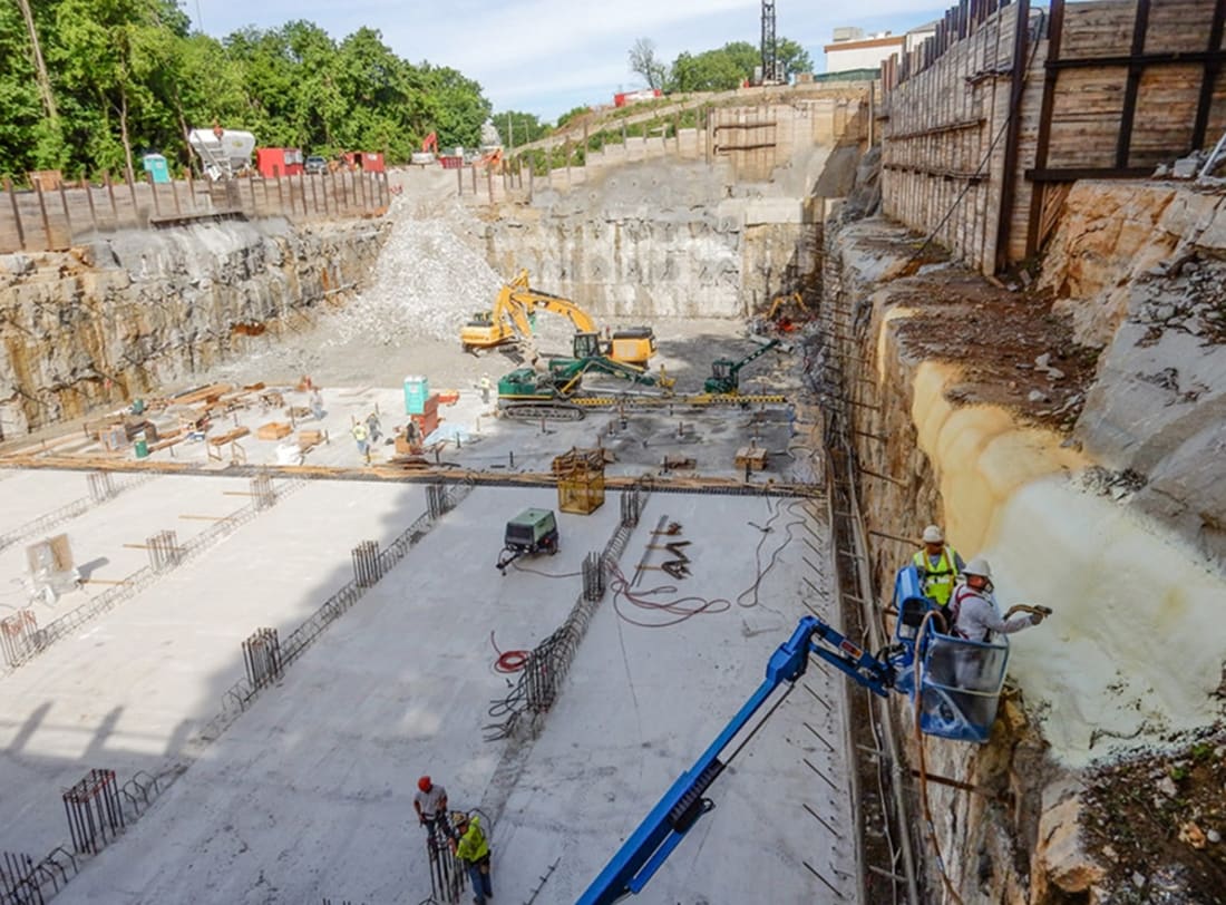 In Louisville, KY a large pit, 40ft deep, 300 yards long x 150 yards wide was dug to build an overflow facility for the city’s combined stormwater and sewage systems. A substantial amount of this excavation was rock, with the top 4ft being very unstable. Large chunks of the rock had broken off creating large cavities at the top section. The City needed to do a cavity fill and create a flat plain in order to tie in rebar forms to construct the facility’s concrete walls and foundation.
