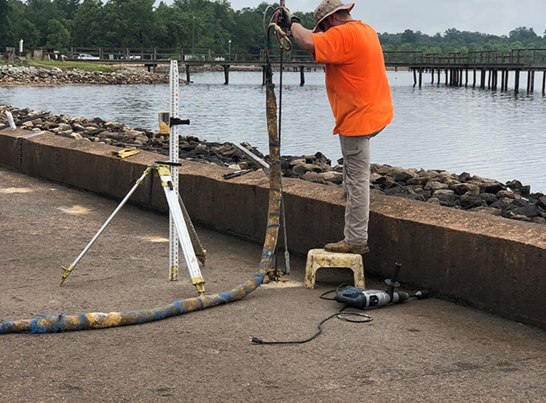 To repair the seepage, MDWFP contracted with Bulldog Construction (through a solicited-bid contract) to inject the TerraThane 24-003 high-density polyurethane into the weak soil zones to fill the voids, stabilize the soils, and stop the water seepage through the dam and the spillway.