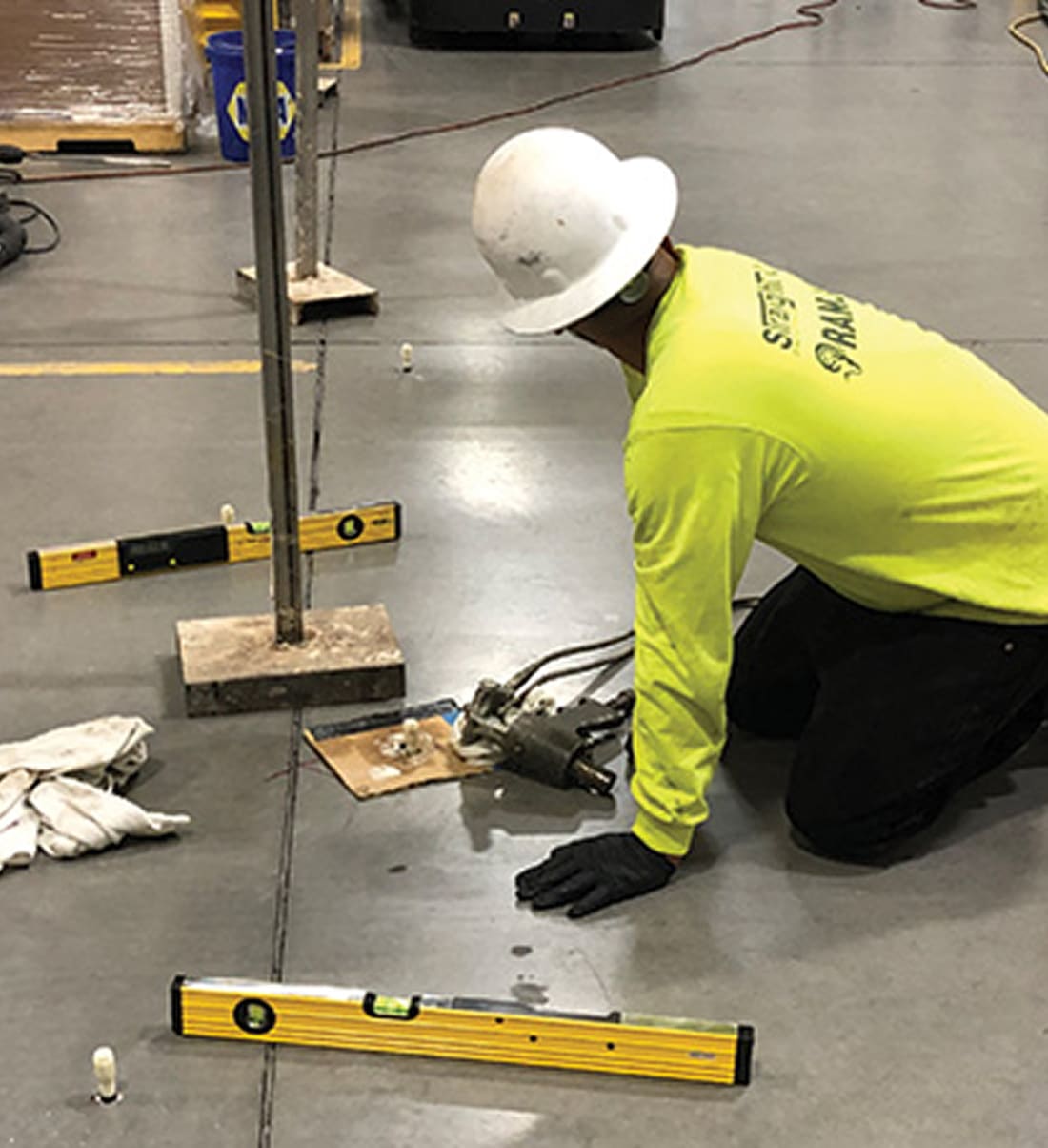 This observation was key to recommending the correct repair method for the owner and tenant. The interior floor consists of adjoining 20’x 20’ individually poured slabs. Typically, when lifting a slab on grade, injections are started in the “deepest” part of the dip. In this case that would have been near the center of each 20’ x 20’ slab. Since the rocking was due to slab curling and not settlement, however, there was no dip in the middle of the slab to lift. And because of Ram Jack’s identification of the curling, they avoided the mistake of lifting in the center of the panel that would have raised the entirety of these relatively small slabs, including the edges, worsening the problem instead of fixing it.