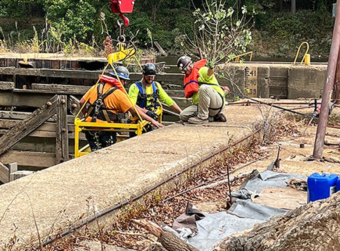 The William O’Huske Lock & Dam is a legacy structure that used to help boaters and commercial vessels move their way up and down the Cape Fear River in Cumberland County, NC. The Lock, which is maintained by the U.S. Army Corps of Engineers – Wilmington District, was experiencing soil loss and voids due to water infiltration through the wall’s joints at the upstream and downstream gates. The soil loss caused settlement and joint separation throughout the wall, as water was flowing through the lock. This issue caused the structural integrity of the lock to degrade over time, and the Wilmington District needed to address it to prevent the Lock from being a safety hazard.