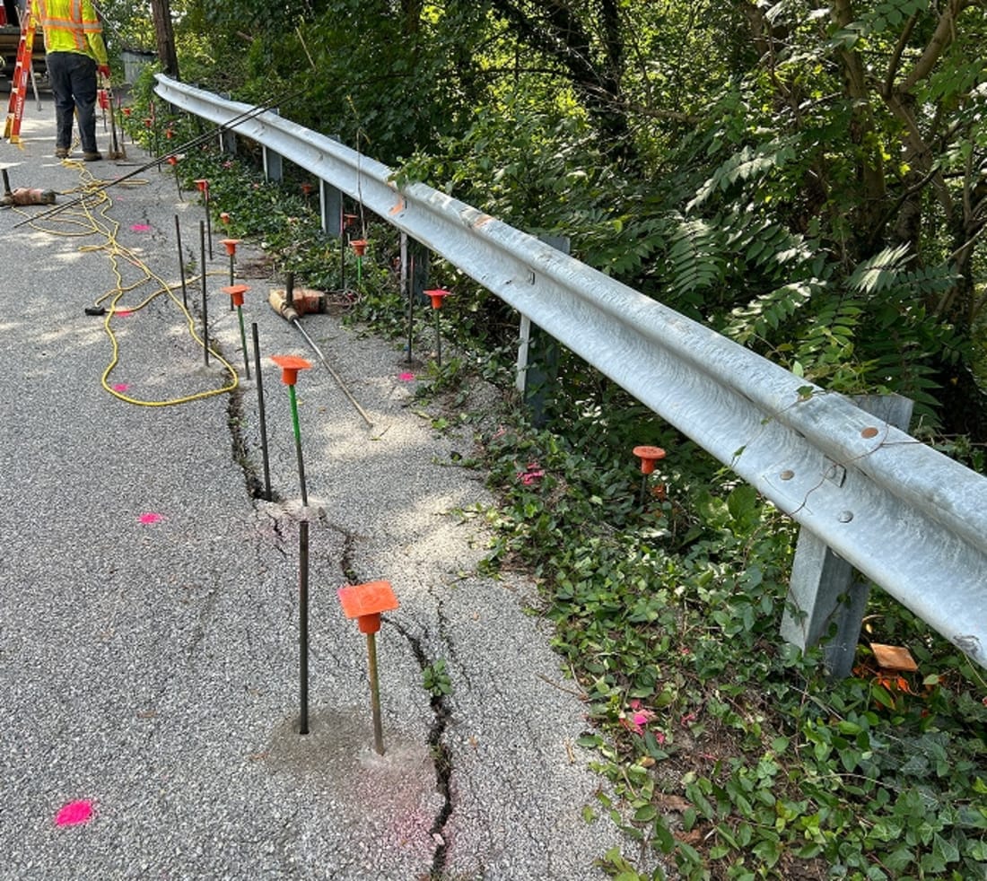 Bridge approach and departure slabs are highly susceptible to settlement from vibration, as well as stormwater runoff, which can cause base soil degradation. With continuous traffic movement, voids form underneath the transition slabs, and they begin to settle. Polyurethane injection is an ideal application for bridge transition slab realignment, as it compacts loose soils, lifts, and realigns the bridge transition slab, and helps prevent future soil loss.