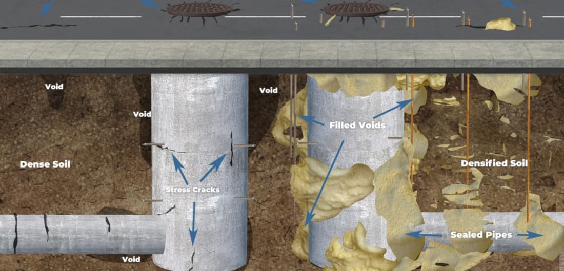 Once the polyurethane is injected, it begins to expand to fill the void and compact unconsolidated soils around the infrastructure asset. The polyurethane will follow the path of least resistance to fill and compact soils. As it does so, it will press against the asset, creating a tight seal and blocking off any cracks or other openings that could allow for water and soil to infiltrate. Due to its hydrophobic properties, the polyurethane will displace any water that surrounded the asset, ensuring a dry environment and preventing damage from moisture.